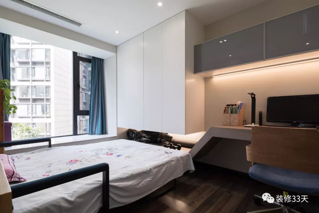 ▲ 书房放置沙发床,定制衣柜与书柜,搭配隔板书桌,打造多功能空间