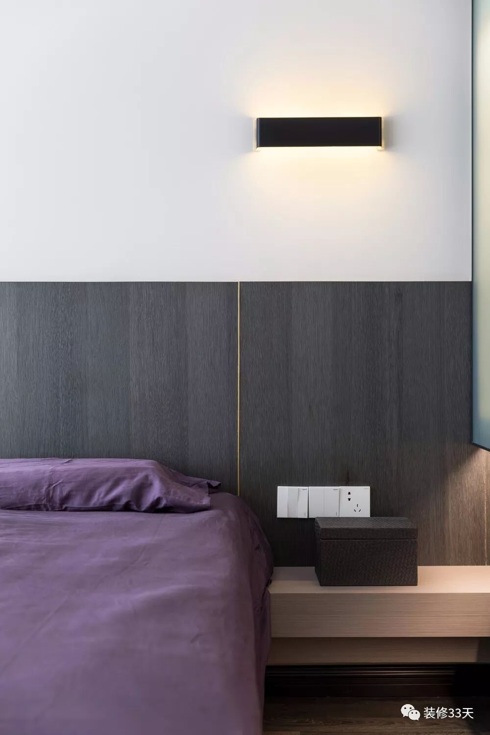 ▲ 床头背景延伸至衣柜,衣柜采用磨砂玻璃门,底部镂空内嵌灯带