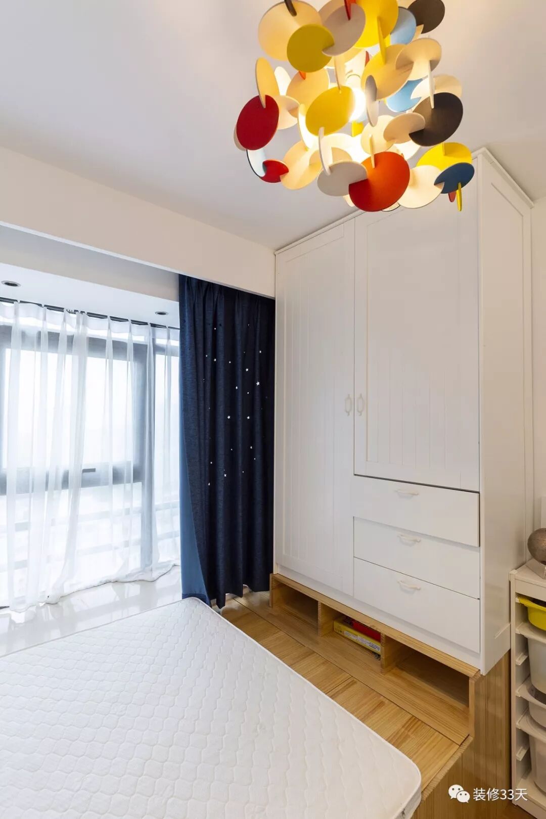 ▲ 儿童房,定制榻榻米连接白色衣柜,顶部造型吊灯增添童趣