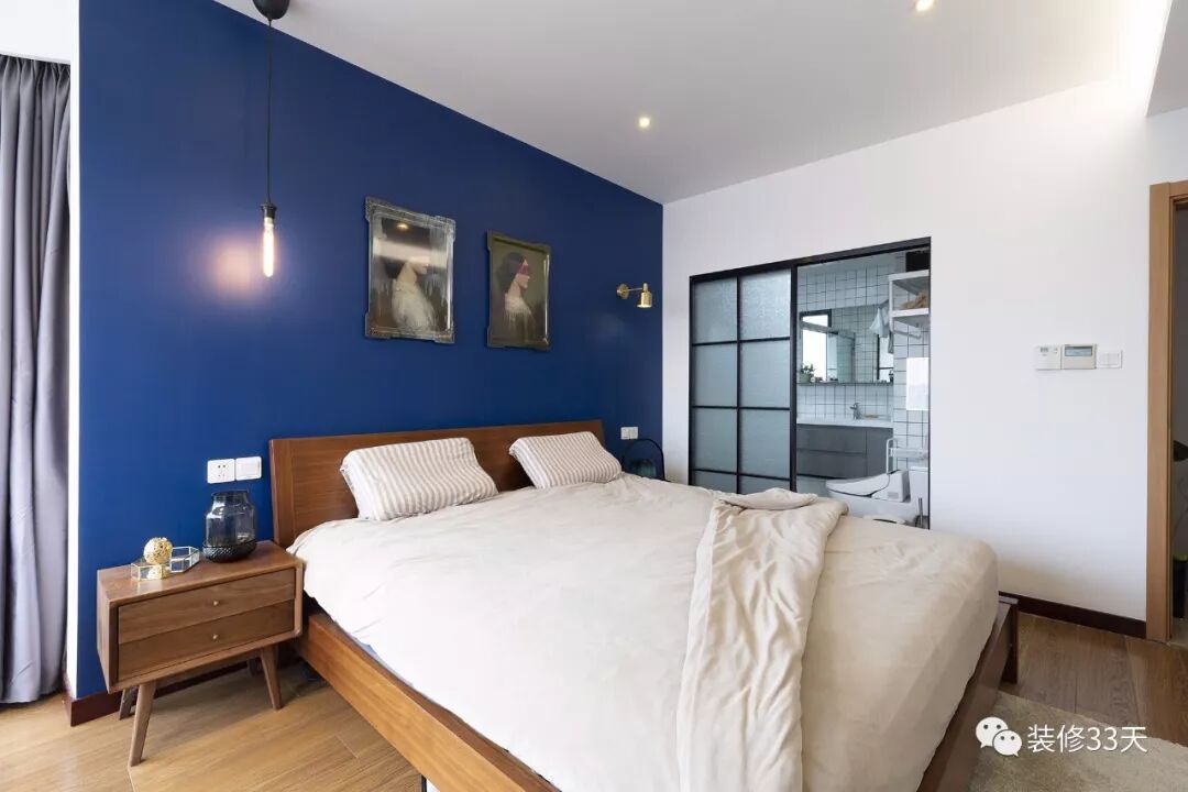 ▲ 轻奢感靛蓝色墙面作背景,床头灯和挂画的金属元素点缀,营造出复古氛围