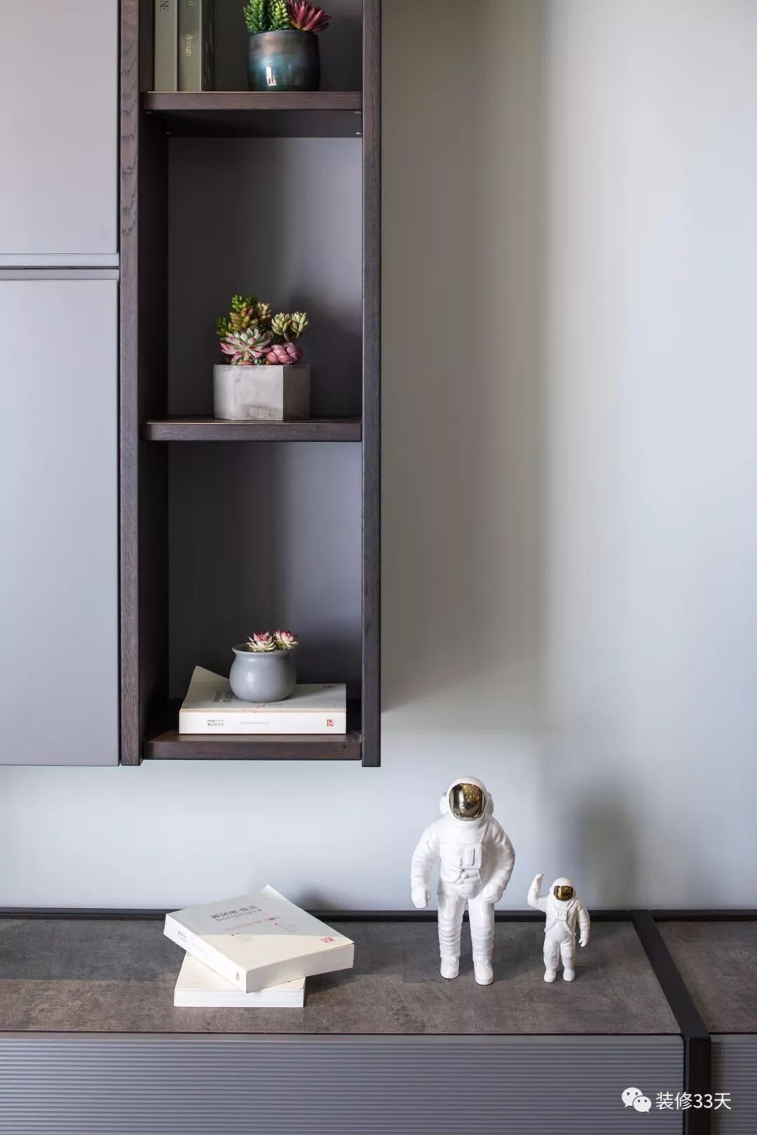▲ 纯色系墙面通过组合柜与层板,构建出实用又耐看的电视背景墙