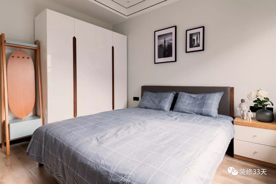 ▲ 主卧以简洁的墙画配以婴儿蓝乳胶漆,成品衣柜与挂衣架增添收纳机能