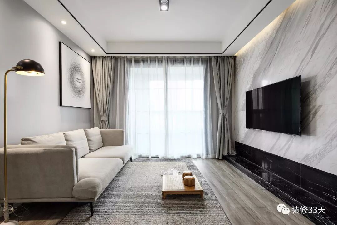 ▲ 正对大门就是客厅,黑白色调的大理石背景简约大气,为避免大门对着沙发,调换沙发与电视的位置