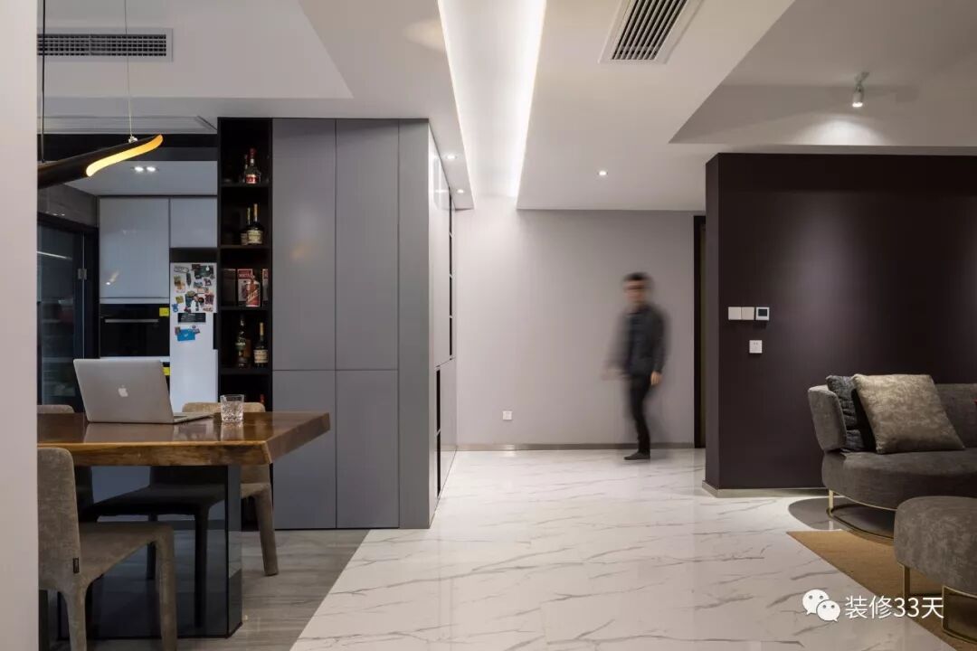 ▲ 客餐厅相连,采用不同色调的地砖划分区域,餐边柜由玄关收纳柜延伸定制而成