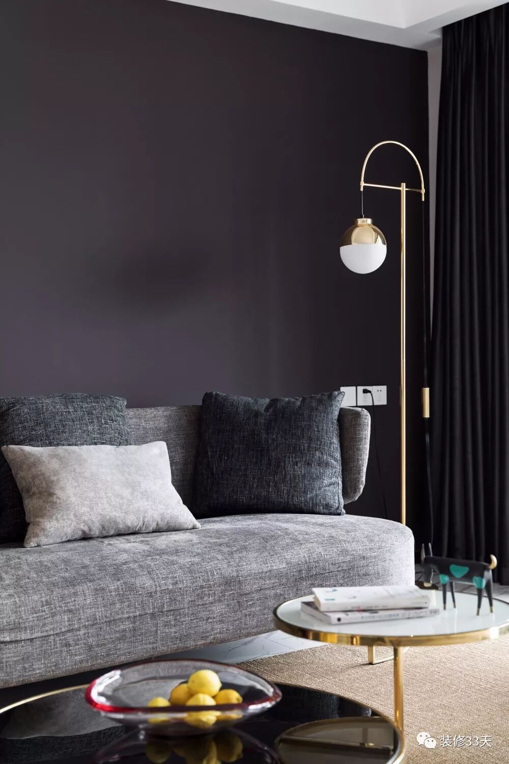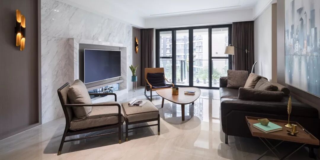 ▲ 客厅,白色石纹地砖,深色背景墙搭配灰色布艺沙发,玻璃移门满足室内采光