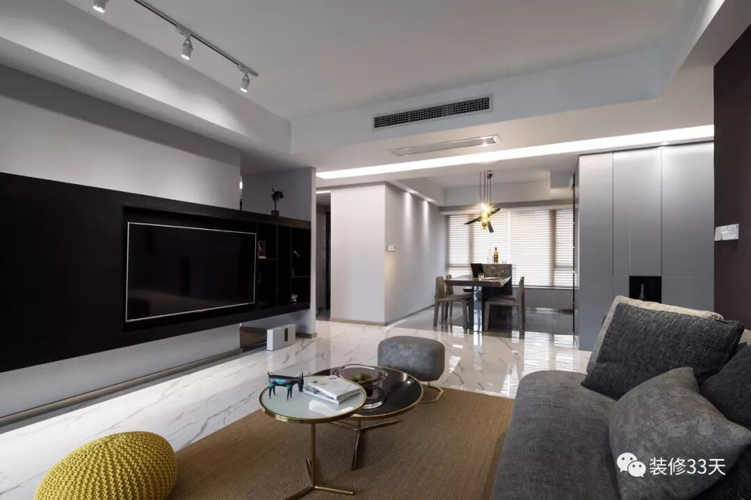 ▲ 利用留白背景墙做黑色悬空电视柜,使墙后的书房与公领域相互连通