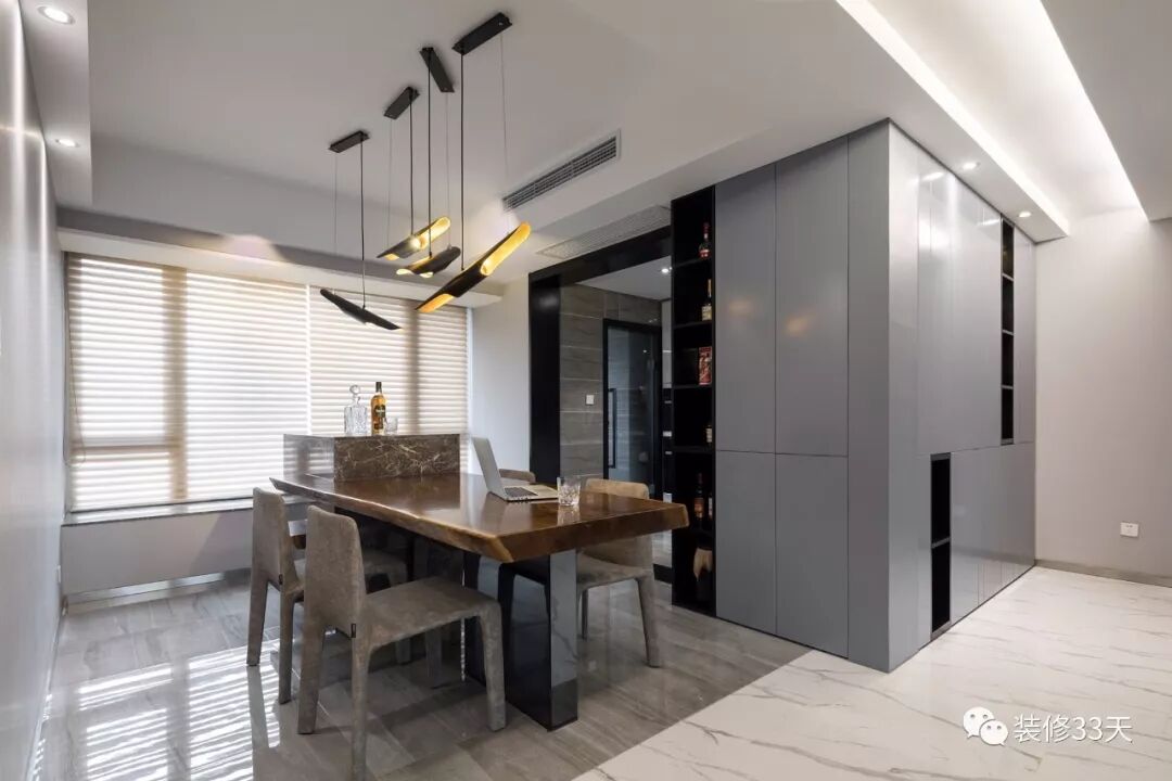 ▲ 餐厅,实木餐桌嵌入大理石吧台,简洁的柔纱帘搭配黑色现代吊灯,提升就餐格调