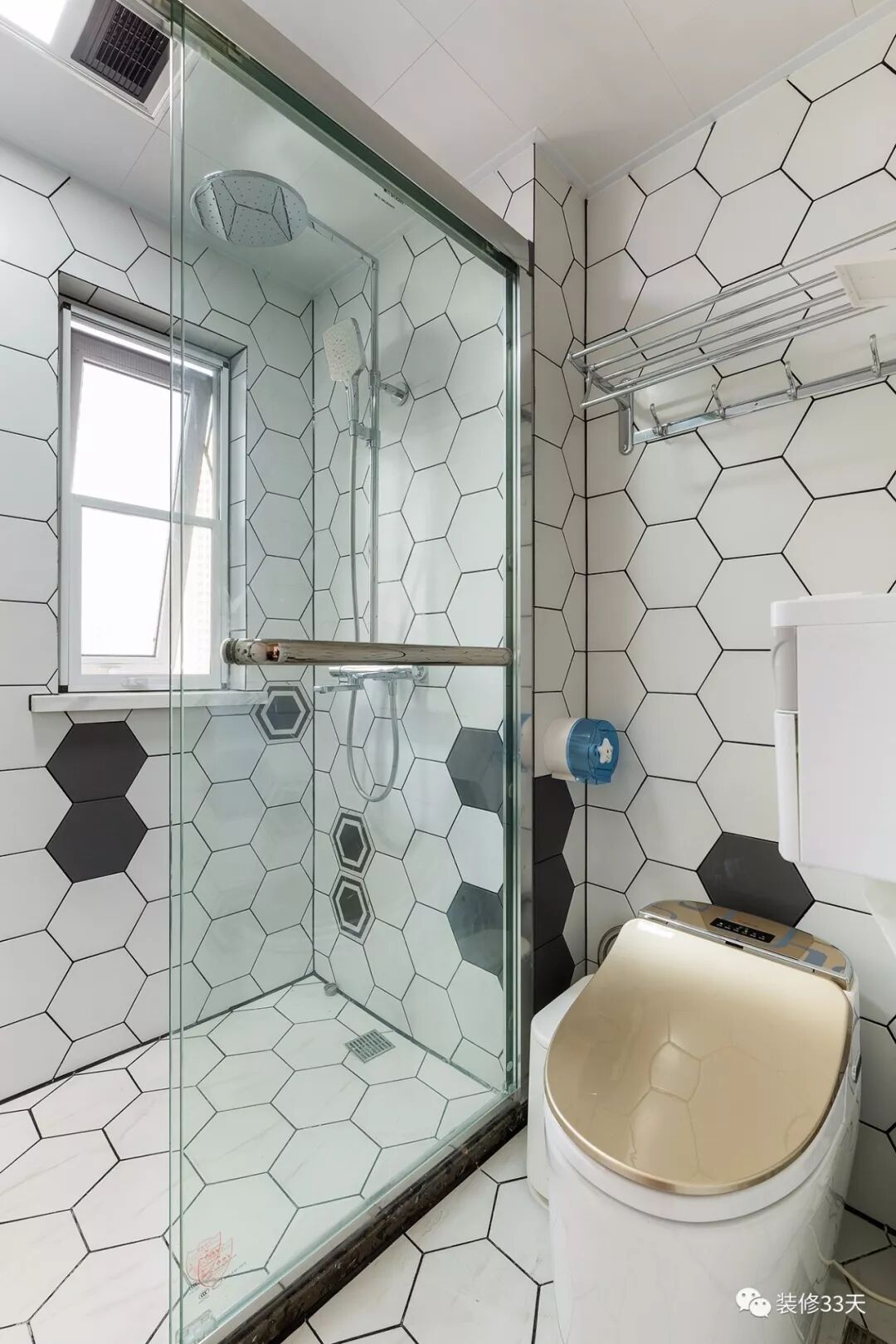 ▲ 卫生间湿区整体通铺六边形瓷砖,在白色瓷砖中零星添加深灰色六边砖,为空间增添灵动性