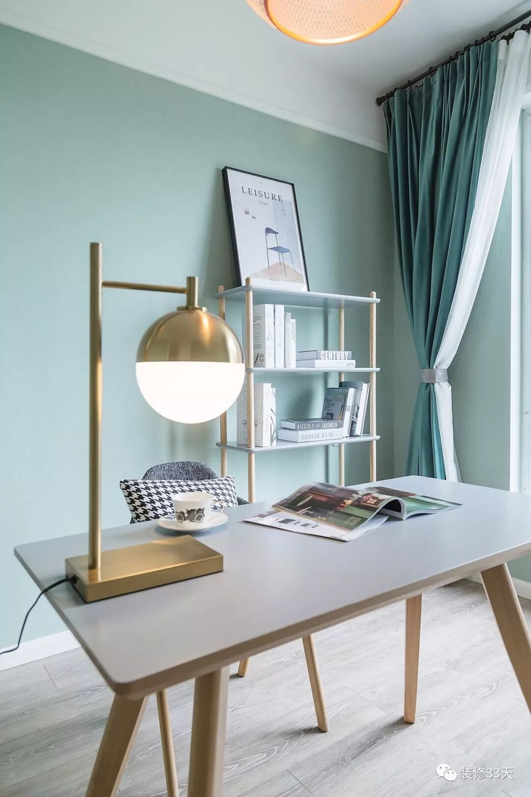 ▲ 薄荷绿背景墙搭配原木色书桌,点缀一盏精致的台灯,为屋主营造清爽安静的阅读氛围