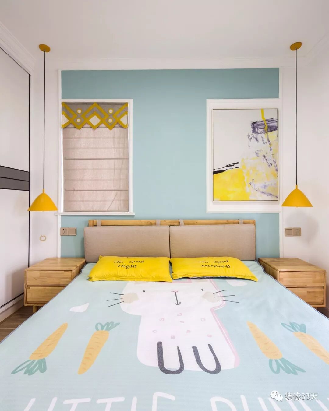 ▲ 主卧,延续马卡龙色系,背景墙设置一扇小窗,窗帘与一侧装饰画色系相结合,形成整面背景墙