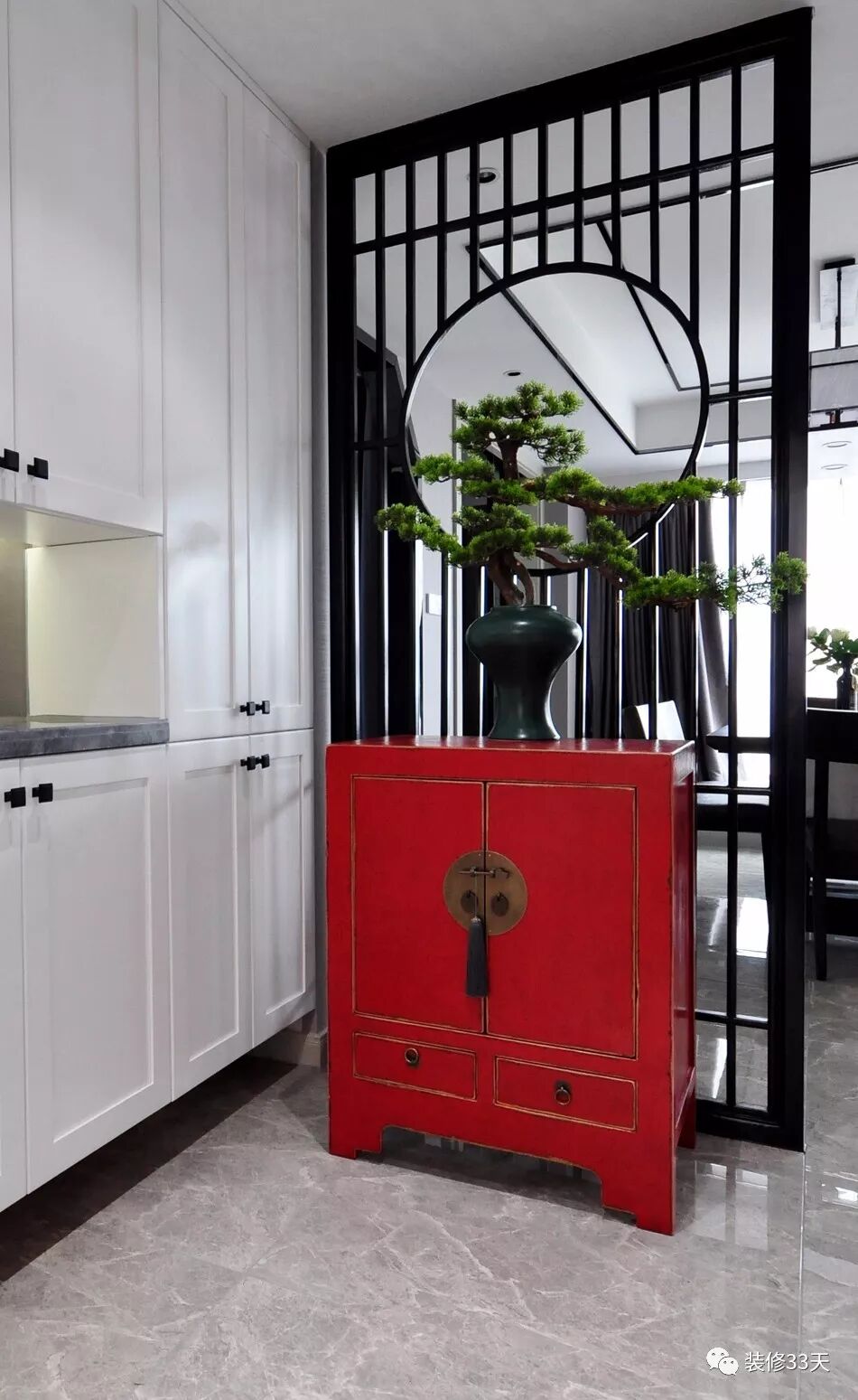 ▲ 使用面积138平,中国红玄关柜,配上黑色隔断,进门给人以强烈的色彩冲击,吸引视线,结合屏风营造东方气质