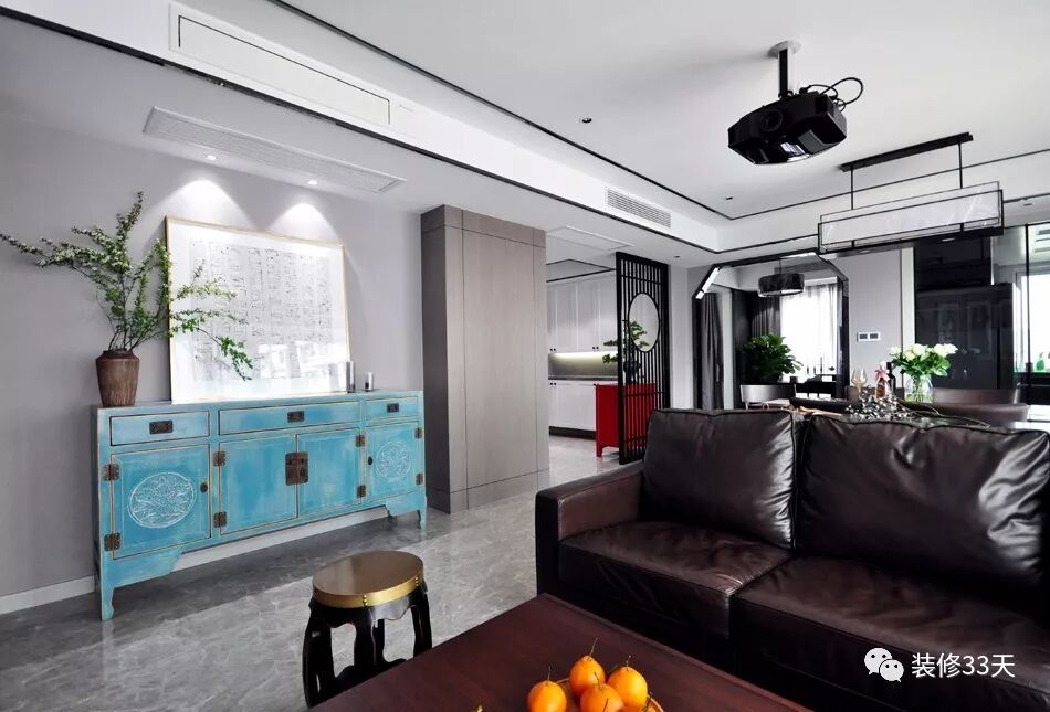 ▲ 咖啡色皮质沙发,侧边采用湖蓝色边柜与装饰画丰富过道空间