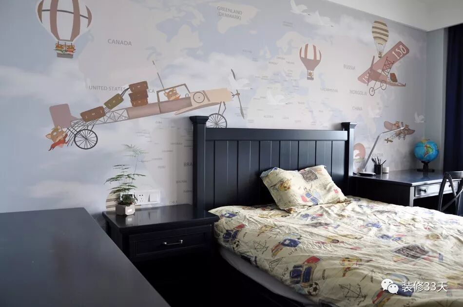 ▲ 儿童房主题墙纸活泼温馨,配合同色床品,互相之间辉映成趣