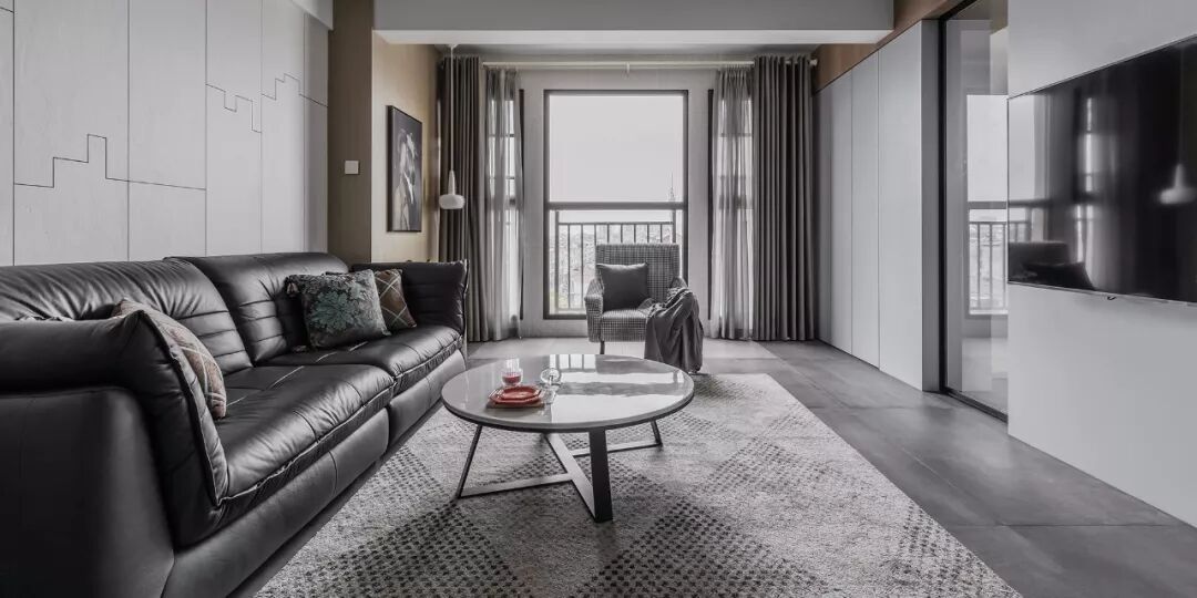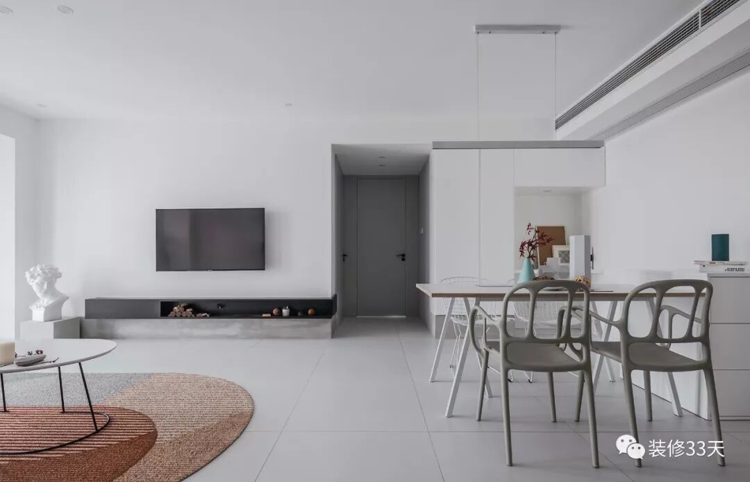 ▲ 黑白灰的电视背景墙,以黑色悬浮电视层板为分割线,过渡水泥灰与大面积留白背景
