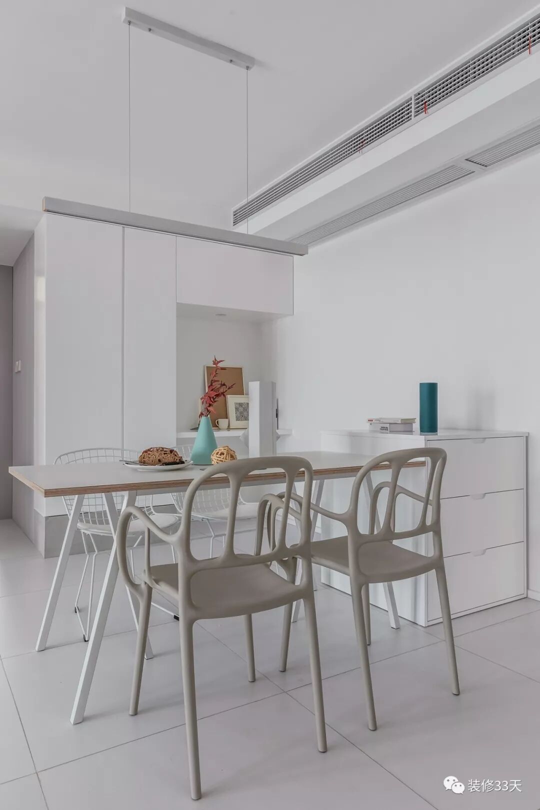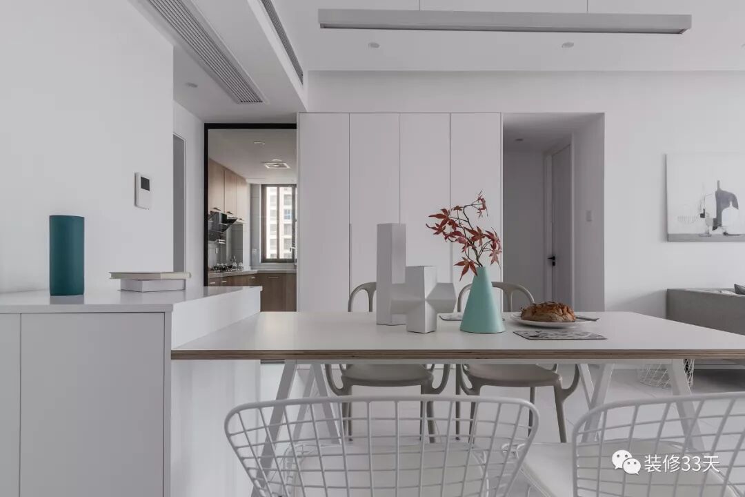 ▲ 餐厅,餐桌紧靠储物吧台,不同款的餐椅增加些许趣味性,餐边柜局部留空辅以台板,置物作端景