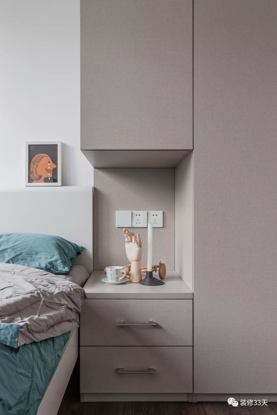 ▲ 客卧延续简洁低饱和的基调,灰褐色的储物柜,在床头位设计出床头柜的机能