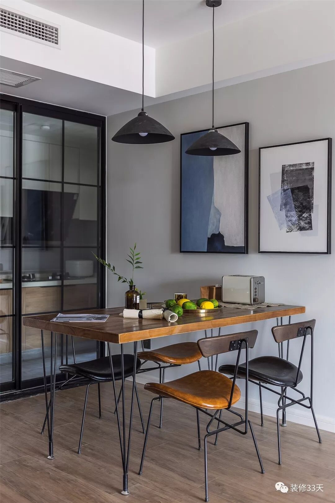 ▲ 餐桌选择老榆木板桌面加铁艺,皮质坐垫与铁艺框架组合而成餐椅,带点工业风的味道