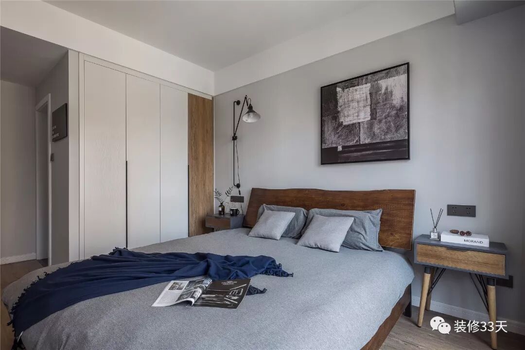 ▲ 主卧以现代轻工业为定调,利用原木、铁艺,装饰挂画,并配合灯光的氛围设置,营造高级质感