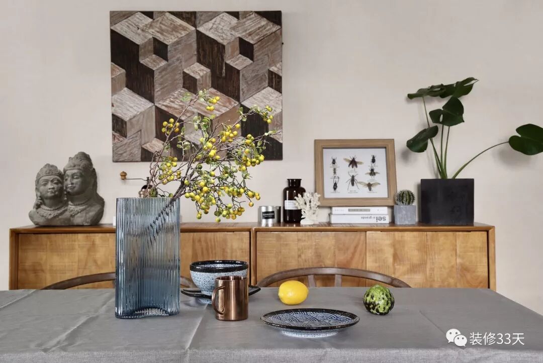 ▲ 餐边柜摆放房主在国外淘回的各种小品,再搭配木制Y椅,轻松自然