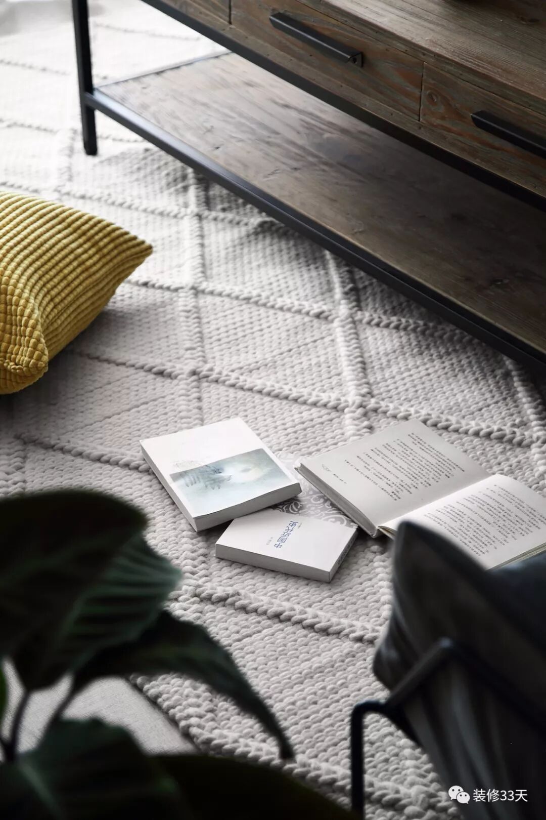 ▲ 客厅木地板加铺大张米色针织地毯,与肌理感木作家具为空间带来原生态的温馨感