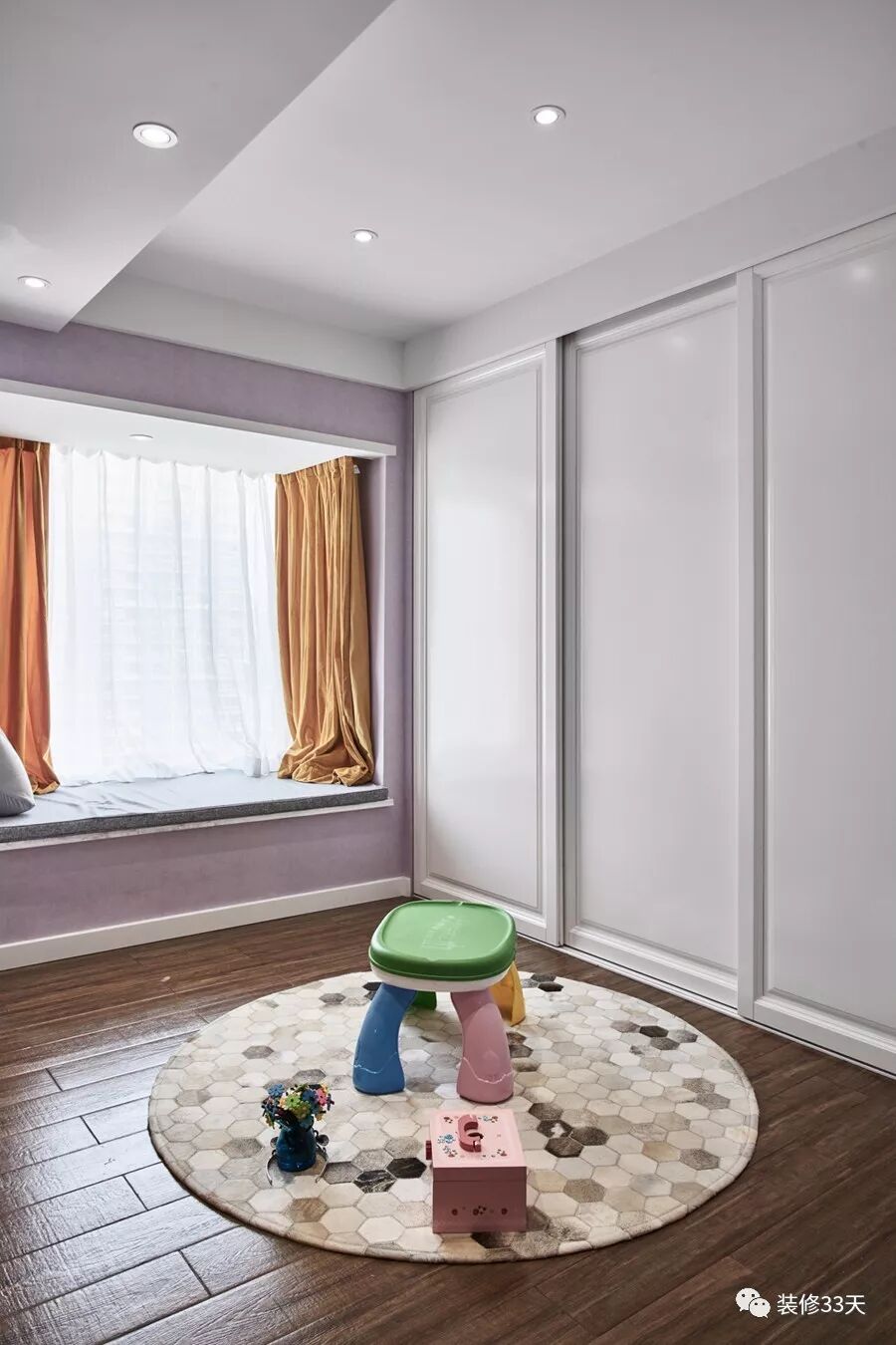 ▲ 造型极为简洁的衣柜移门,飘窗打造成可卧可坐的阳光休闲一角