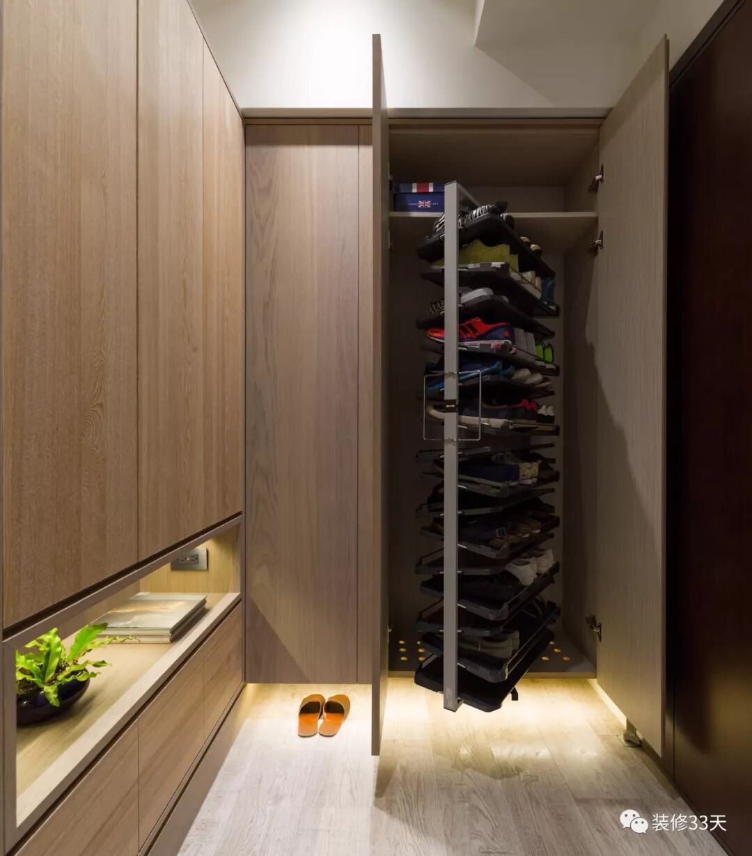 ▲ 如果你家的鞋柜深度有四五十厘米,可以考虑做双层旋转鞋柜。看上去很酷炫,其实从能放鞋子的容量以及制作成本来看,这种鞋柜是不划算的。