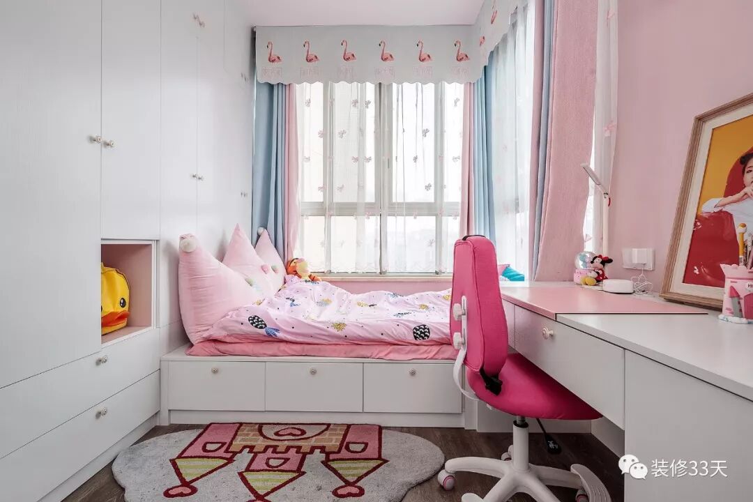 ▲ 儿童房以粉白为基调,靠墙设计榻榻米,留出更多空间打造柜体与写字台
