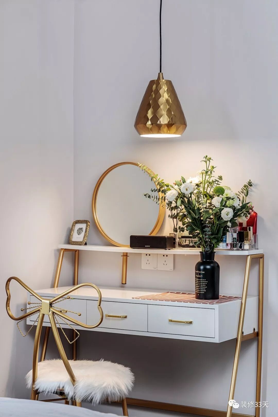 ▲ 床尾的一角放置成品梳妆台,家具的金色元素与台灯成套呼应,鲜切花在灯光下散发清新气息