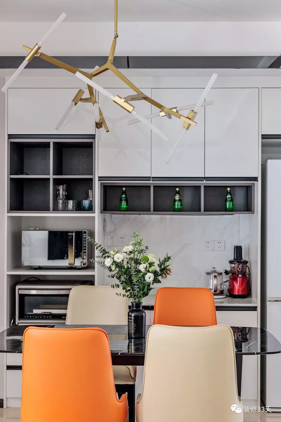 ▲ 现代风餐桌椅搭配北欧风吊灯,餐边设计多功能背景柜,满足展示、收纳与小吧台的功能