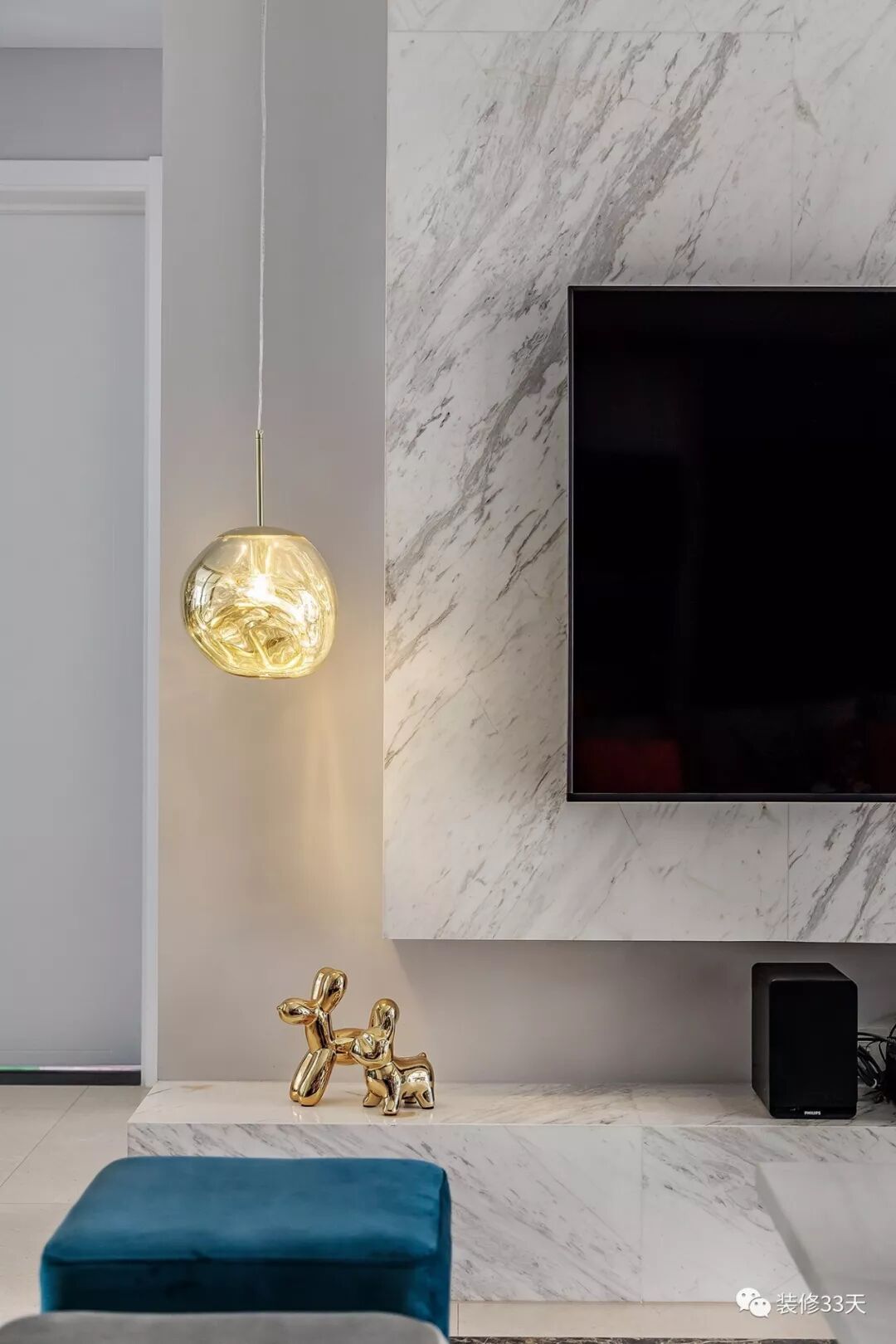 ▲ 天然的大理石纹理碰撞蓝灰丝绒脚凳,一盏线性吊灯,造型充满设计感