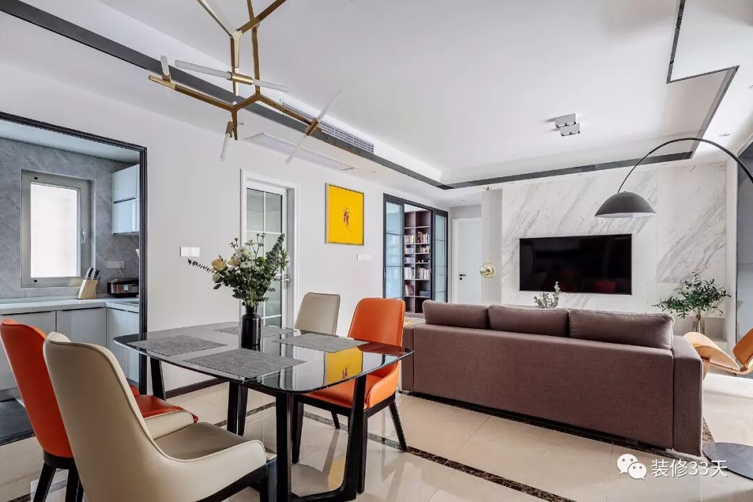 ▲ 餐厅与厨房相邻,采用黑框玻璃折叠门作空间隔断,有效隔离油烟,不影响空间的通透性