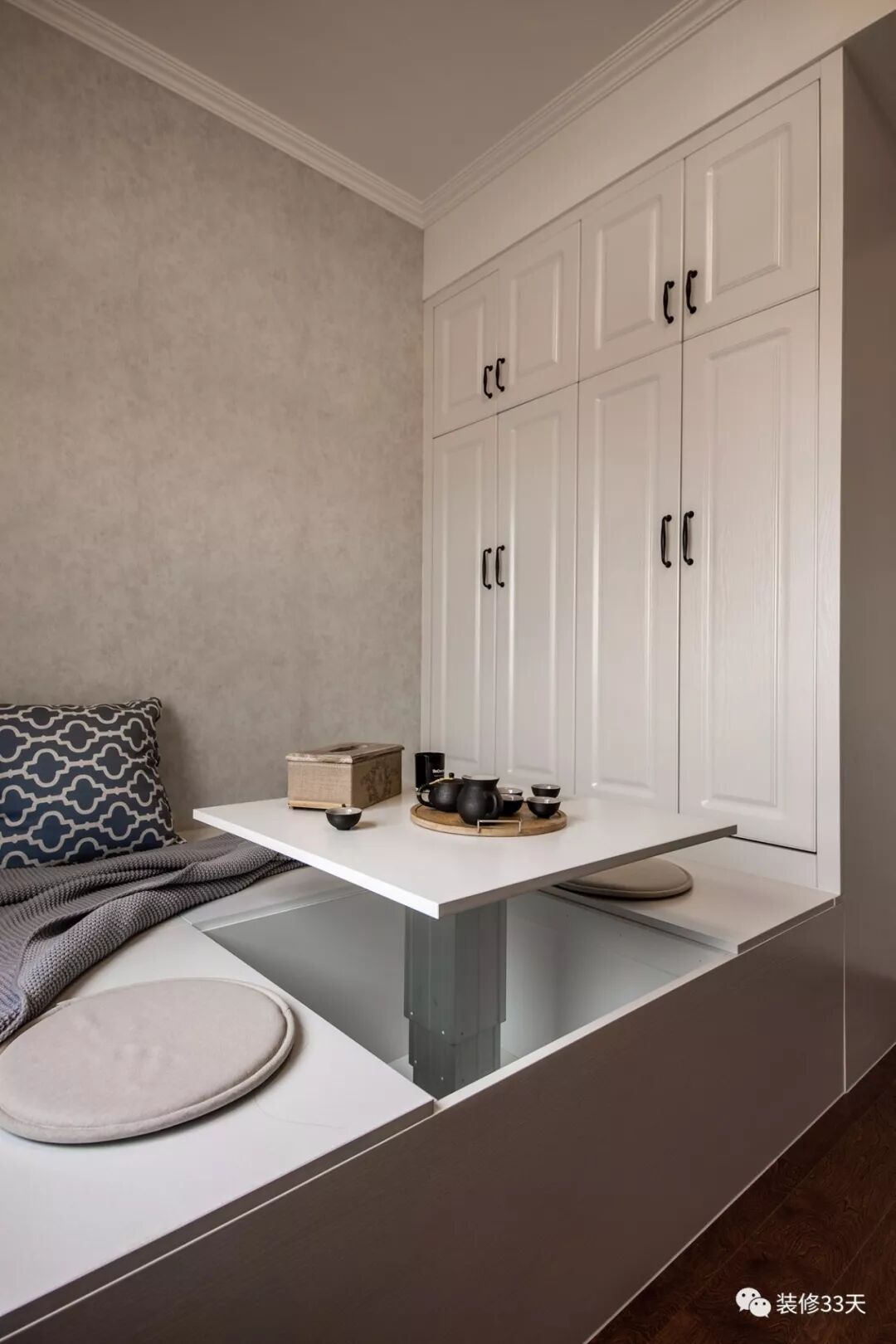 ▲ 定制集榻榻米+衣柜+茶室为一体多功能房,上升式茶桌的巧妙设计,不仅可以作为床、也可以是桌子、茶几等等,非常实用