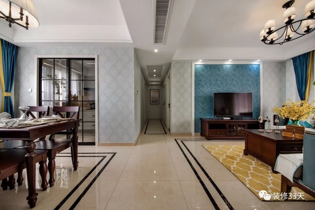 ▲ 客厅电视背景墙为湖蓝水纹墙纸加实木线条装饰,与恬淡静谧的落地窗呼应,舒适又时尚