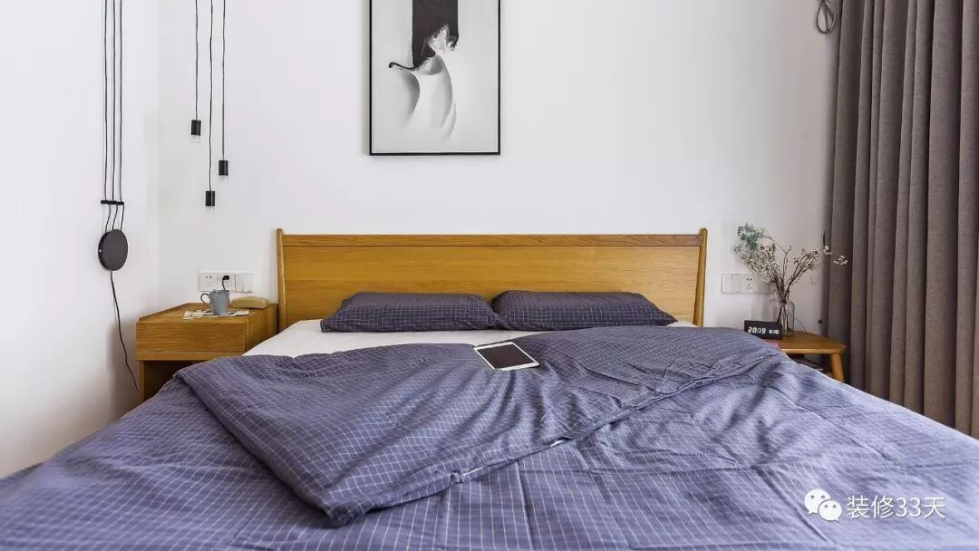 ▲ 主卧延续留白搭配木色元素家具,蓝灰色布艺软装调节空间色调比例