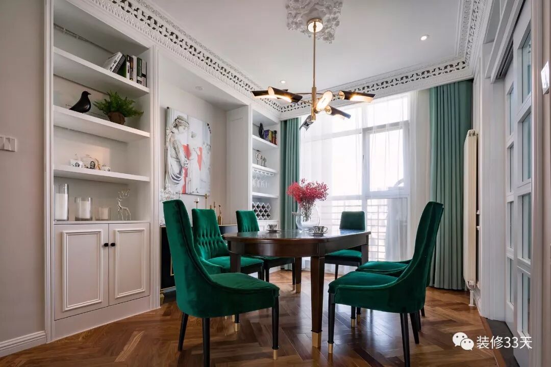 ▲ 咖啡色木质餐桌搭配复古绿丝绒餐椅,后方餐边柜更是充满艺术格调