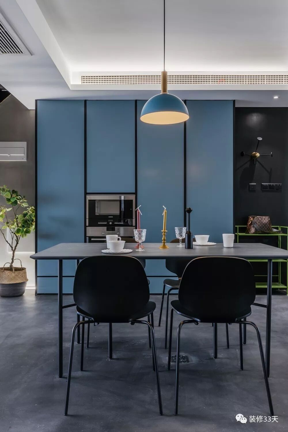 ▲ 蓝色餐边柜勾勒黑色线条,搭配同调暖光吊灯,肌理和光泽汇聚成舒适的就餐空间