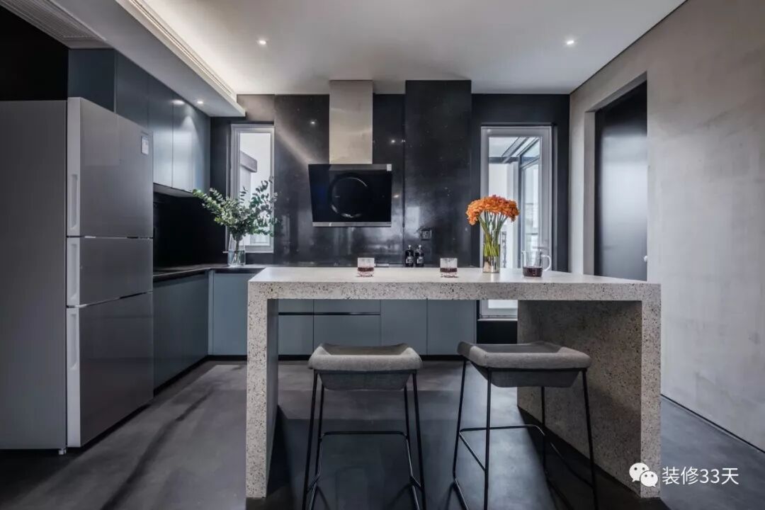 ▲ 开放式厨房,设计异形岛台,平行四边形造型呼应保留的挑高斜顶,有些另类的可爱