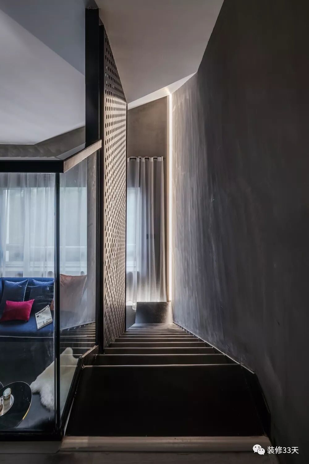 ▲ 黑色铁艺通高隔墙,保证上楼安全性,同时拉高视觉空间感