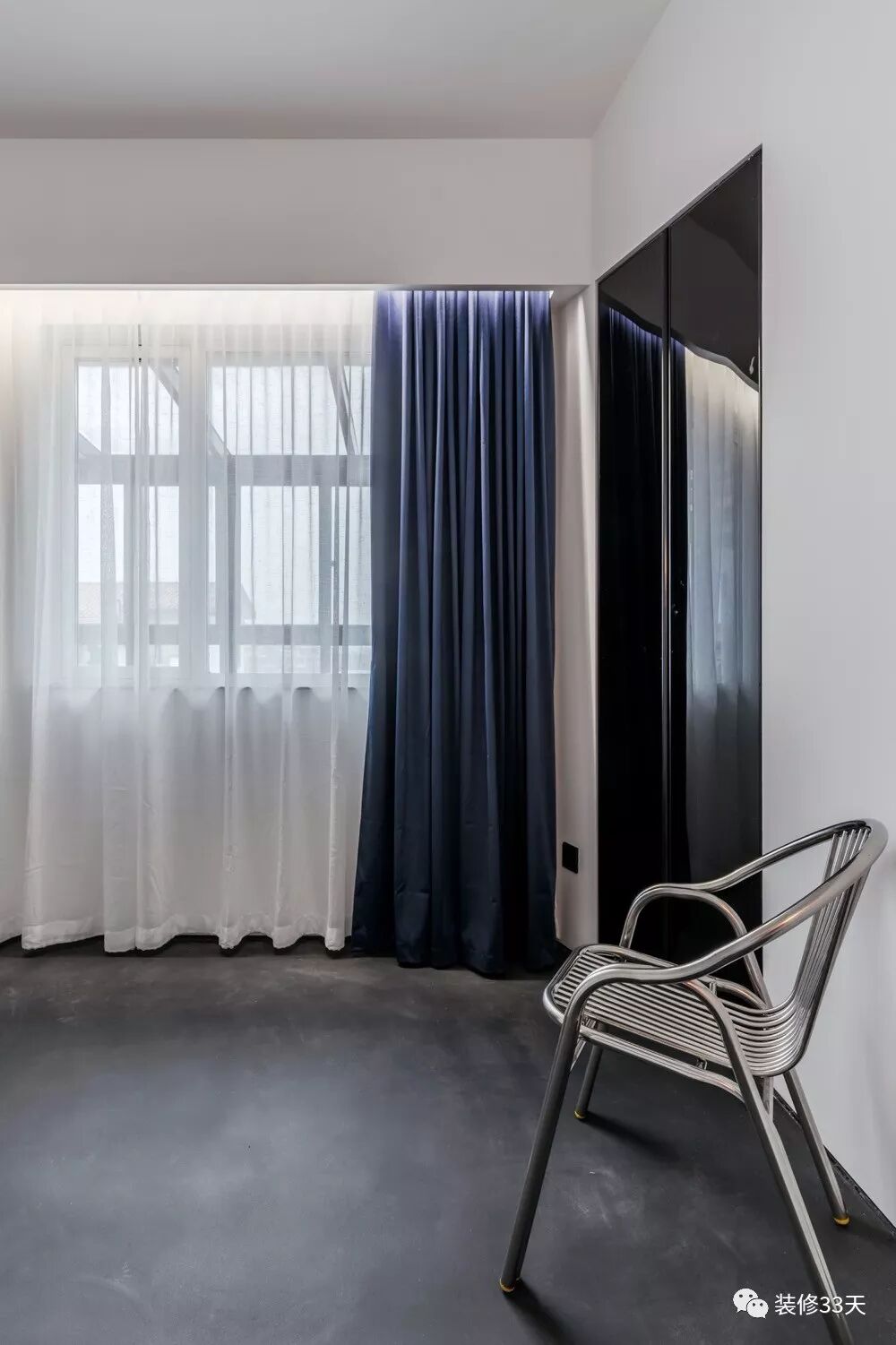 ▲ 次卧,暂时规划为休闲区,蓝色窗帘带来舒适感,墙面嵌入的黑色柜体具备装饰机能