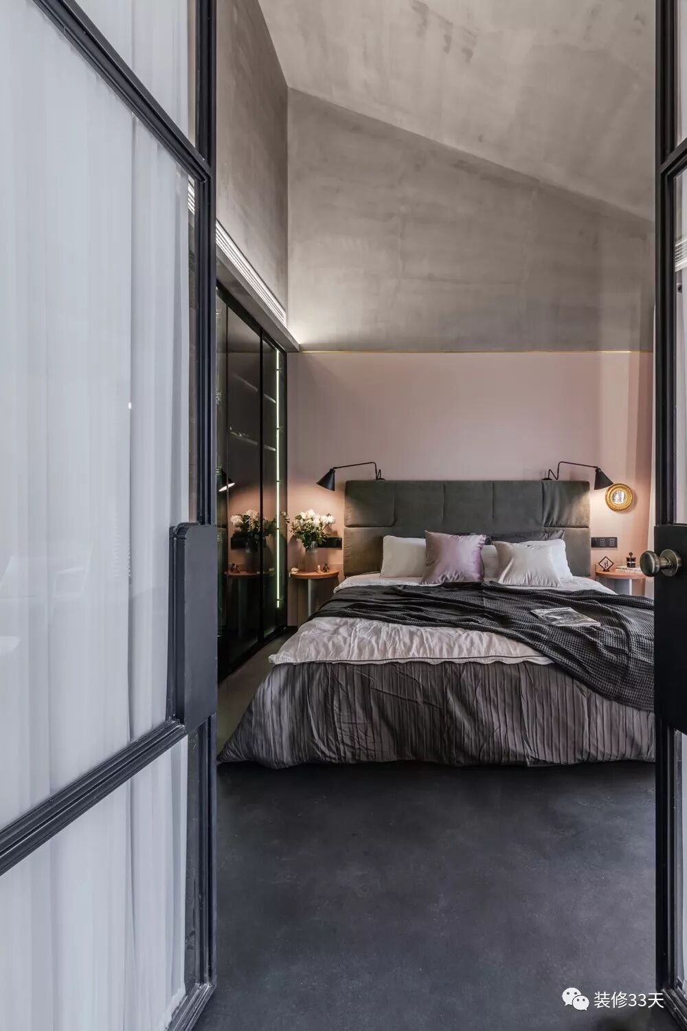 ▲ 主卧纳入阳台空间,采用粉色乳胶漆扮靓墙面,再以金属线条收边,避免大面积灰泥带来的清冷印象