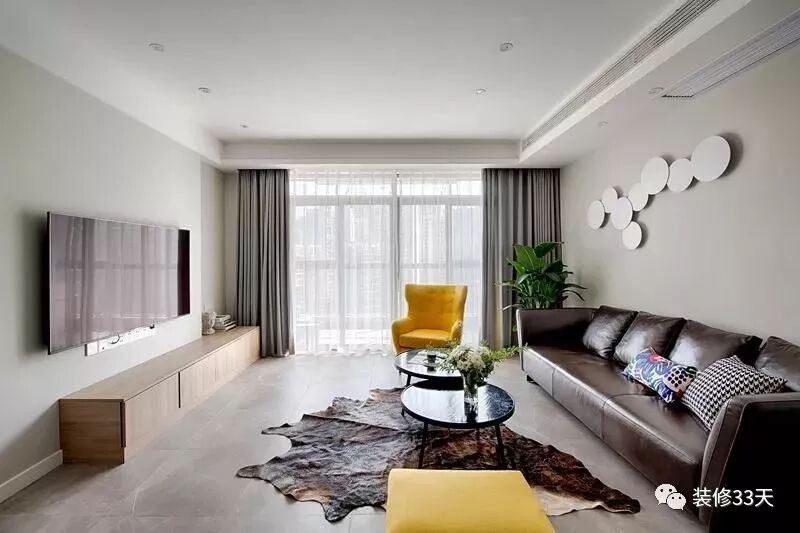 ▲ 简单的乳胶漆搭配咖啡色的皮质沙发,最后跳跃一个姜黄色的宜家单人位,内敛朴素而不显枯燥