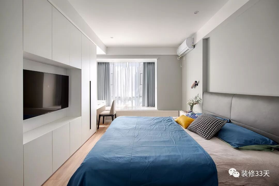 ▲ 长方形的主卧放弃衣帽间而改为衣柜形式,由于过道偏小,在床头位置砸半墙让给床的位置,这样整个空间就能满足整排衣柜的方式