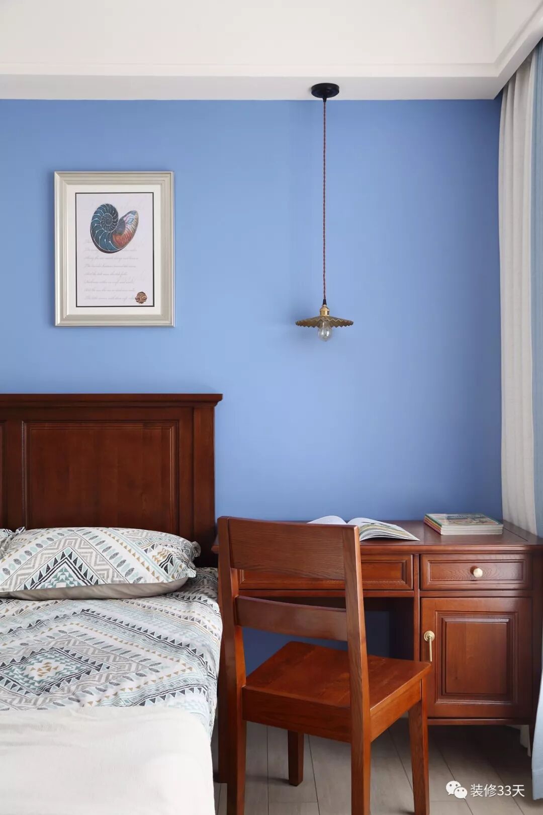 ▲ 床头点缀美式装饰画,边上设计小书桌替代床头柜