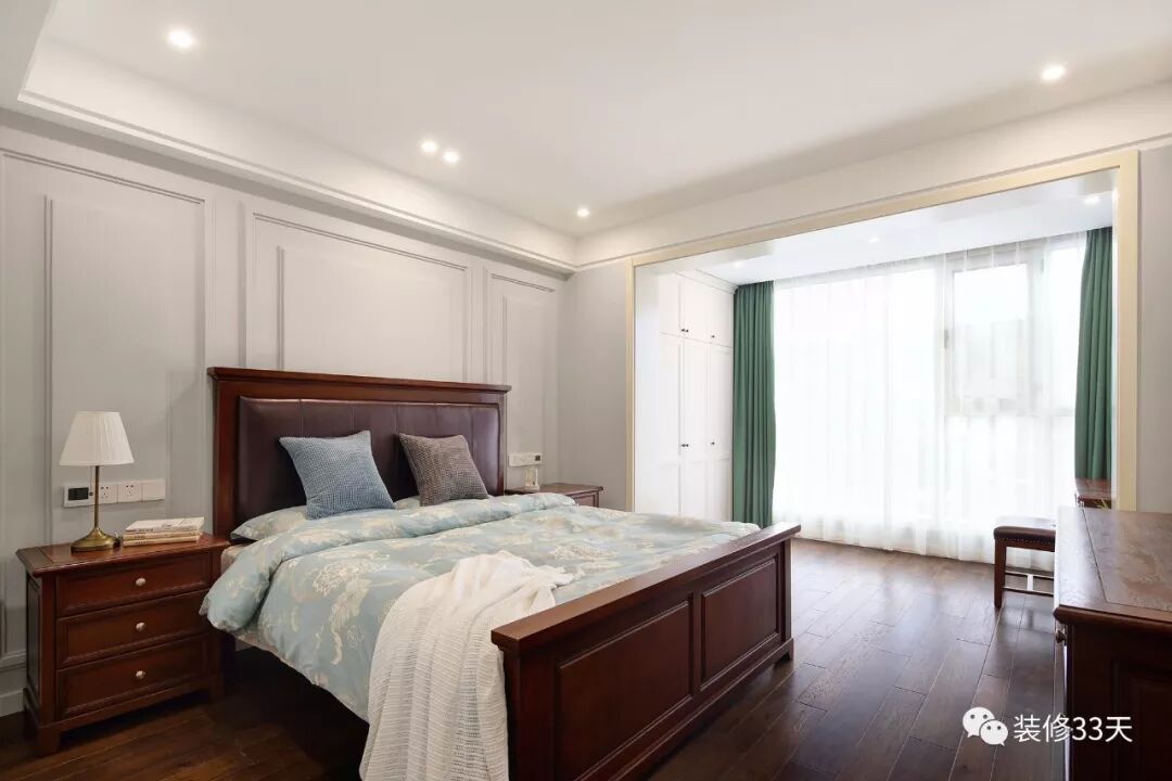 ▲ 主卧纳入阳台扩大使用面积与采光,灰色石膏线打造层次感床背景,极简顶面平衡美式家具的厚重感