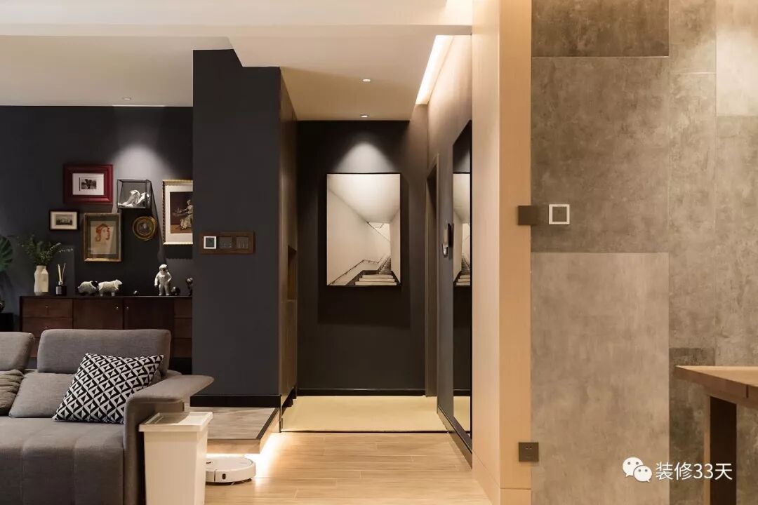▲ 建筑面积115平,使用面积91平,90后的业主想要一个简洁干练,却又与众不同的个性空间,设计师从玄关开始运用冷酷黑+温润木