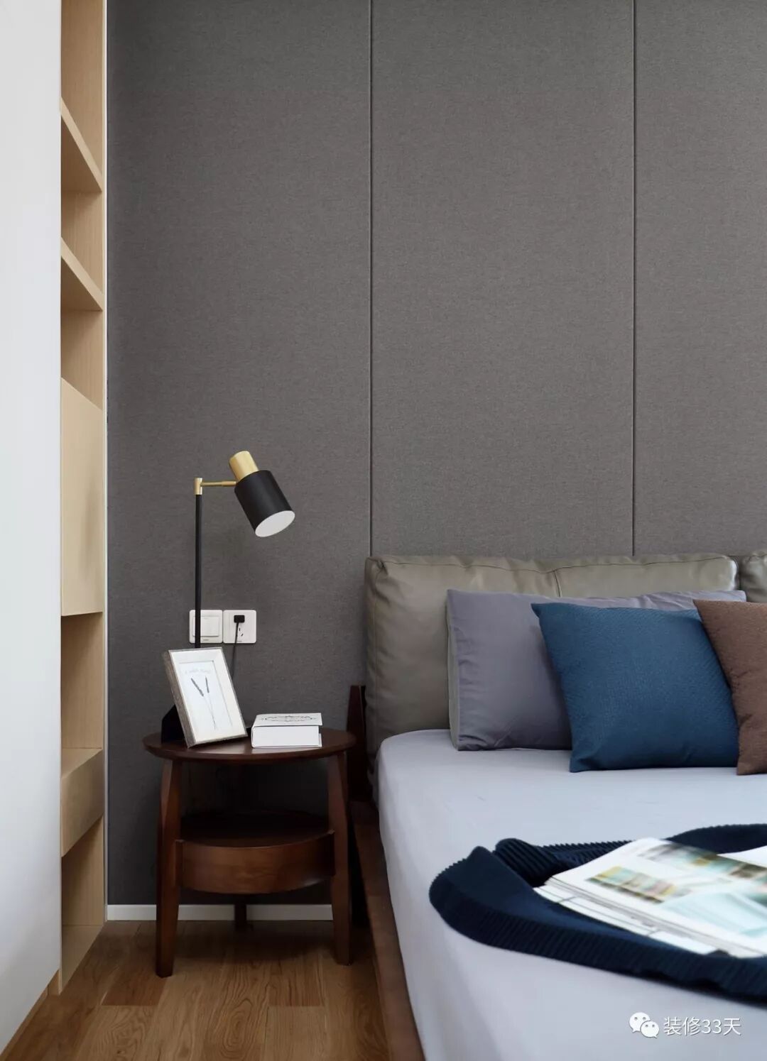 ▲ 卧室以原木和白色为基调,低调沉稳的深灰色硬包做背景,明亮的落地窗让阳光洒满整个卧室空间
