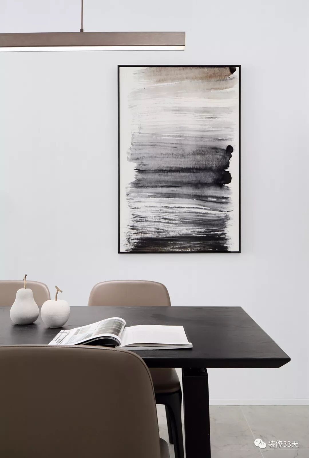 ▲ 咖色皮质餐椅搭配黑色餐桌,顶面装一盏极简吊灯,留白墙面用抽象画点缀