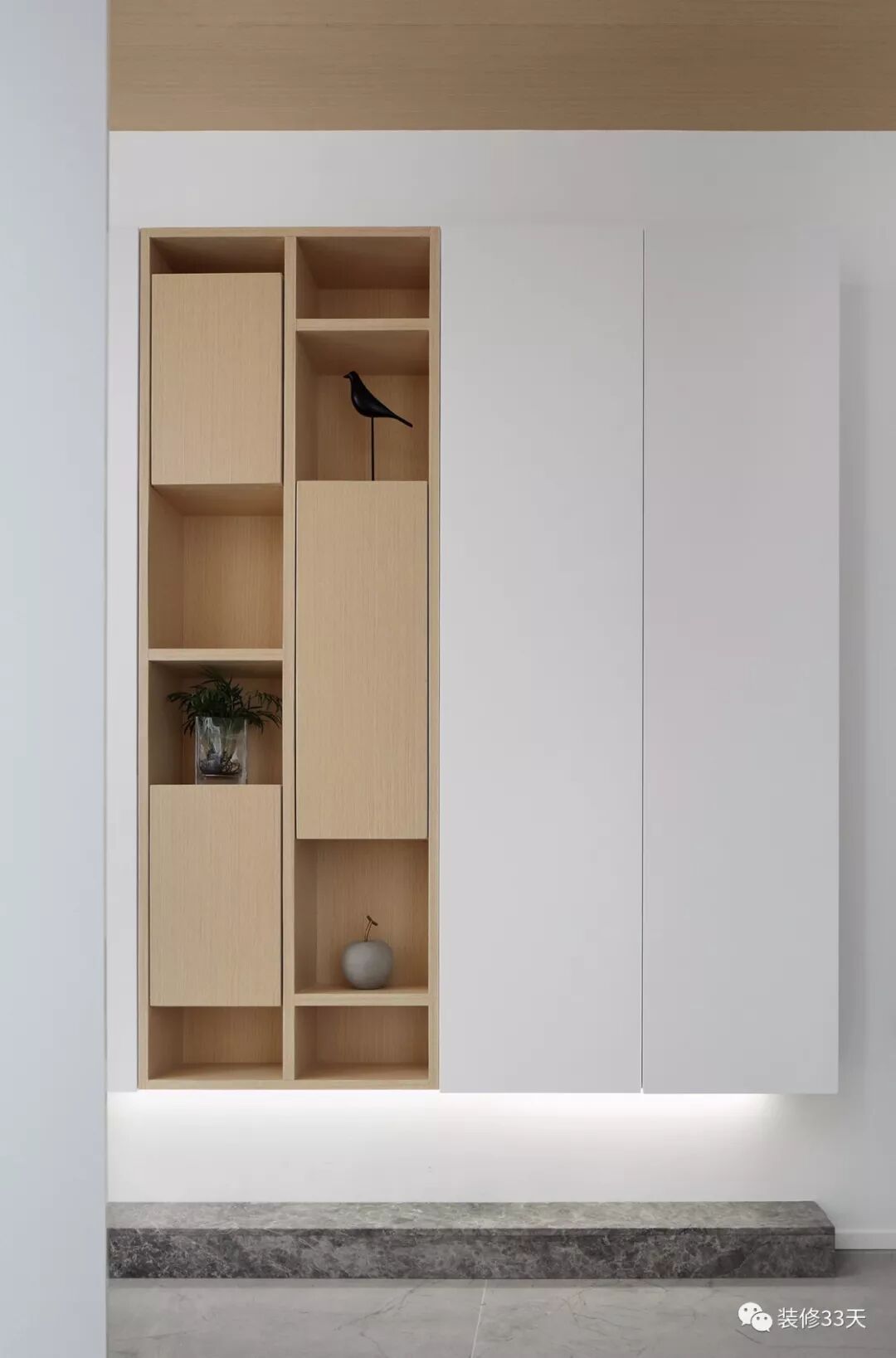 ▲ 入户设置15公分厚度的鞋柜,造型上以白木交错,底部嵌入灯带,大理石拉伸墙体视觉高度