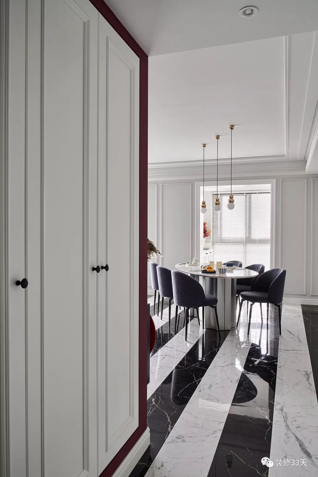 ▲ 餐厨进入私领域的动线,黑白间隔的拼接地砖,搭配赋有设计感的玄关柜,让人眼前一亮