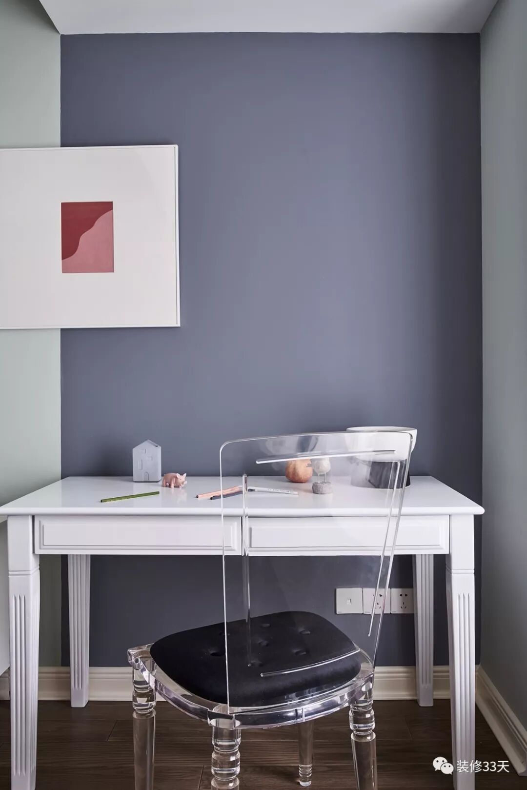 ▲ 窗边写字台,抽象画在结合拼色背景后,有着时空意境,搭配透明座椅,时尚感十足